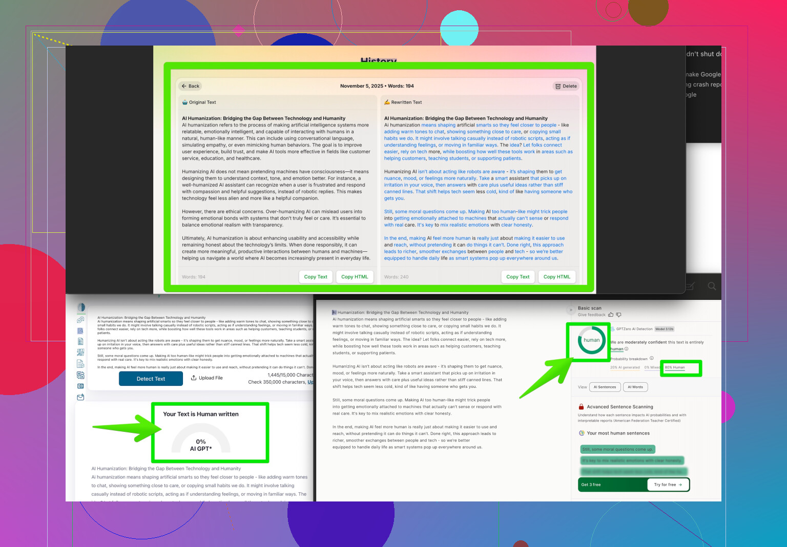 Bottom line? Don’t trust detectors 100%. They’re imperfect, context-ignorant, and easily tricked with even minor human edits or a decent humanizing tool. Proceed accordingly.