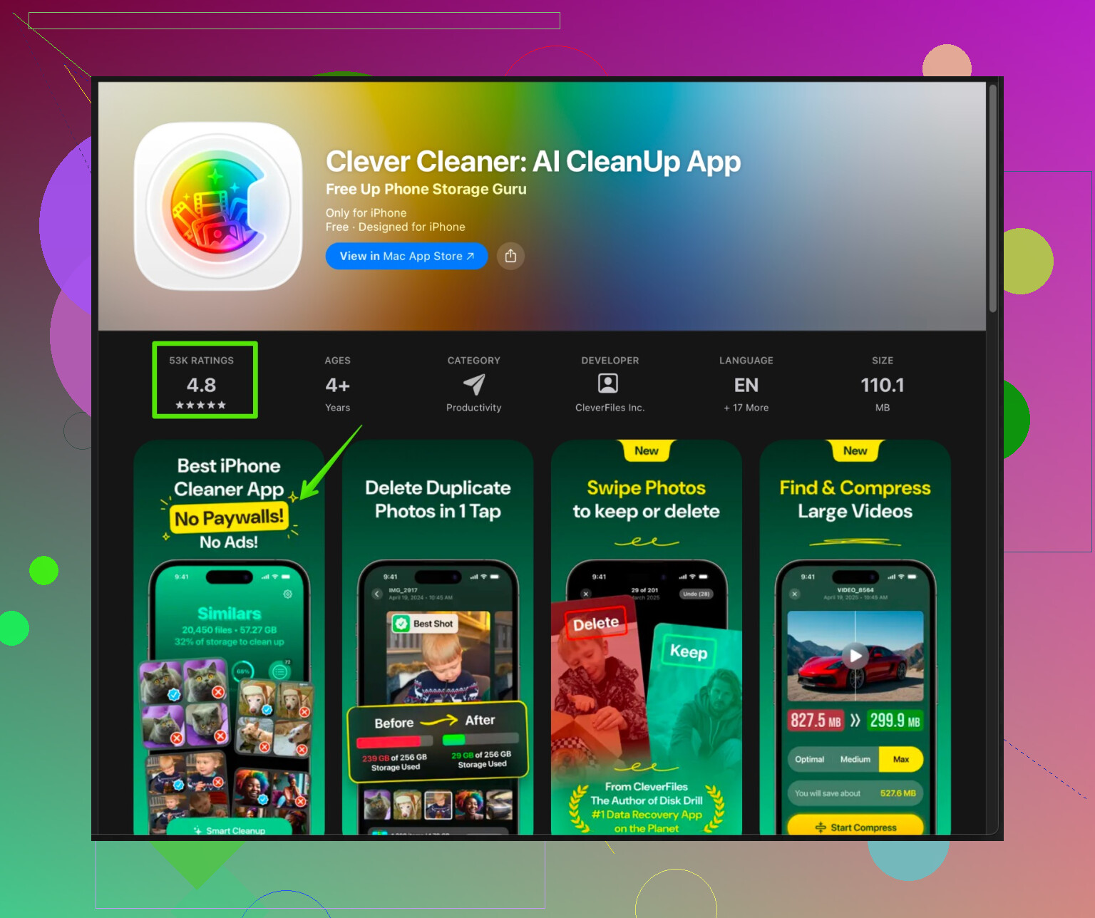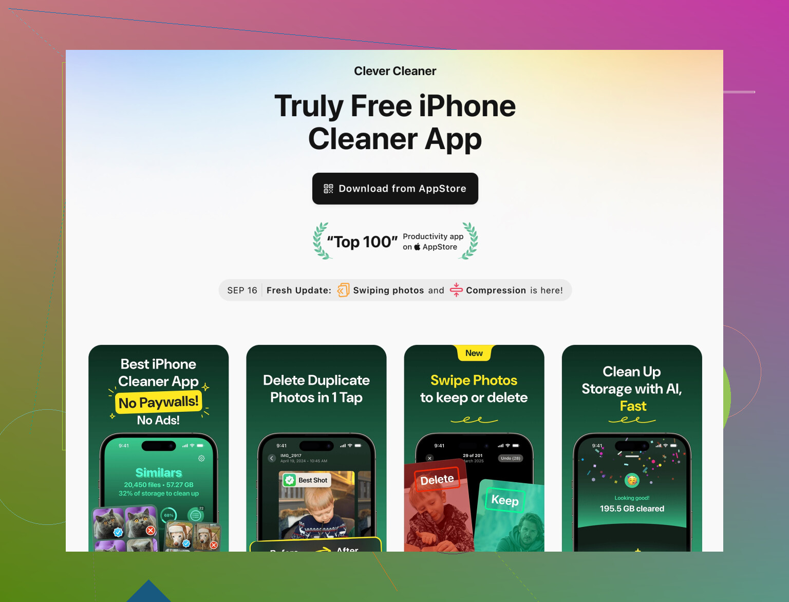 Clever Cleaner App for iPhone は、次の点に特化しています: