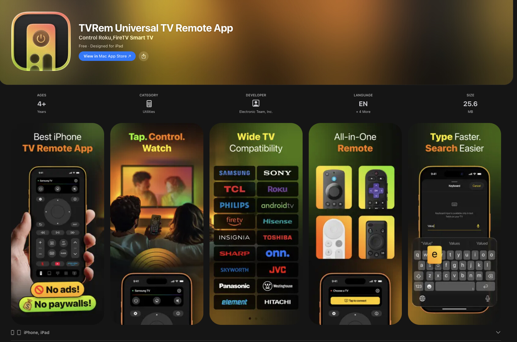 For anyone looking for a reliable alternative, TVRem works as a free Roku TV remote app for iPhone. It turns your iPhone or iPad into a full Roku controller, so you don’t need the original remote at all.