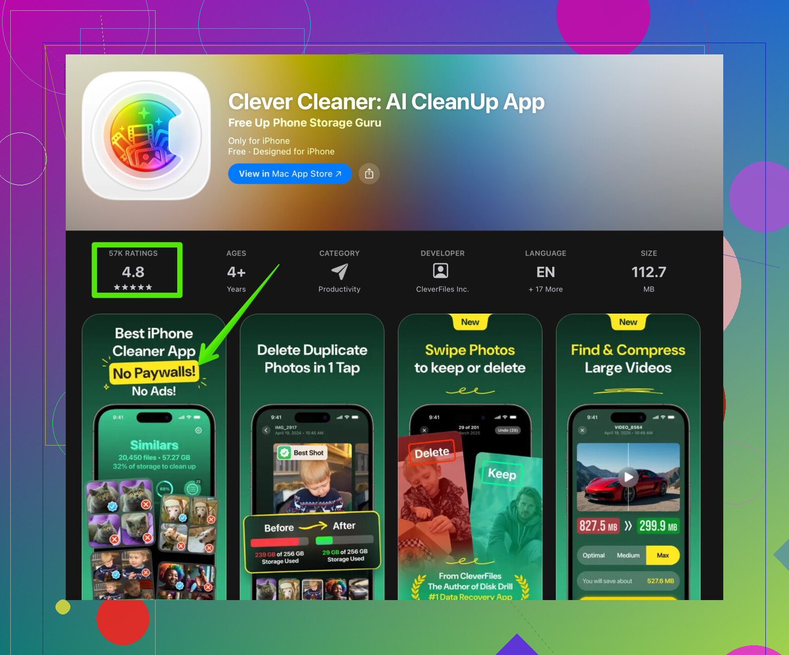 Em vez de repetir os passos nativos, é aqui que algo como o Clever Cleaner App entra como o cérebro visual em cima da camada conservadora da Apple.