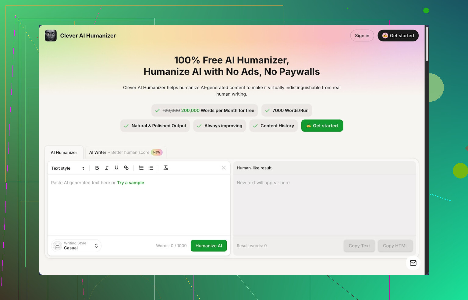 If you’ve hit the Writesonic wall, Clever Ai Humanizer is honestly the only true like‑for‑like free replacement I’ve seen that isn’t pretending to be free and then nagging you for a card. I agree with a lot of what @mikeappsreviewer and @byteguru said, but I don’t fully buy the “run it and you’re good” vibe.