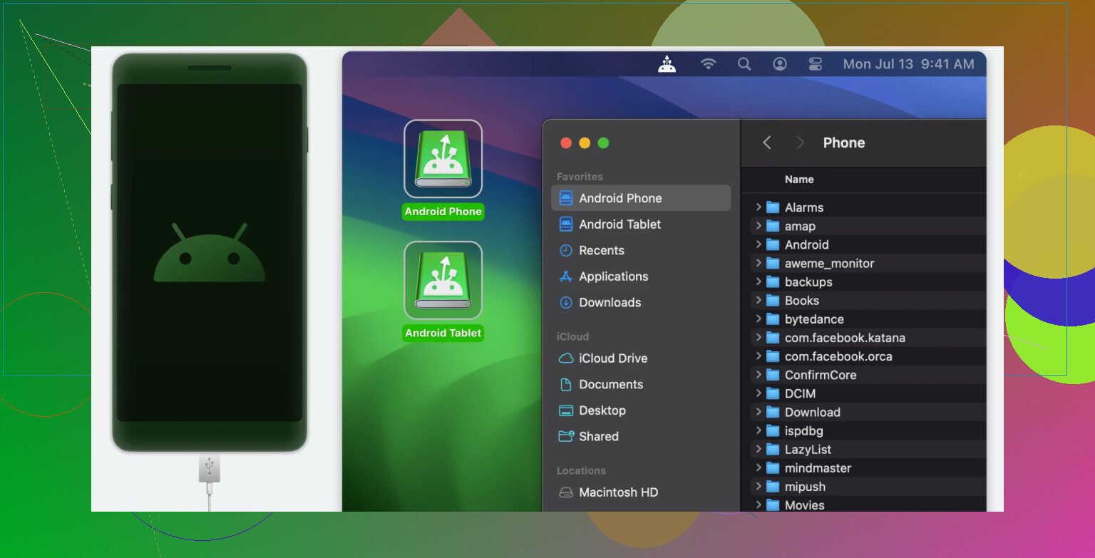 Mounts your phone like a drive: Your Android device shows up in Finder just like a regular USB stick or external hard drive.